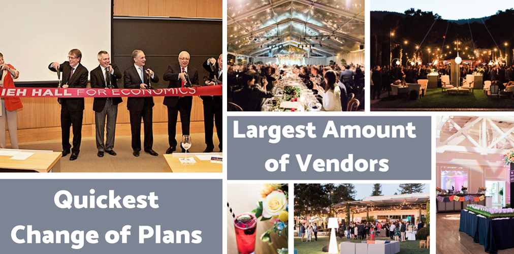 Left Photo: Complete change of event format and layout due to security concerns 90 minutes before event kick-off (University of Chicago, Saieh Building Dedication ).
